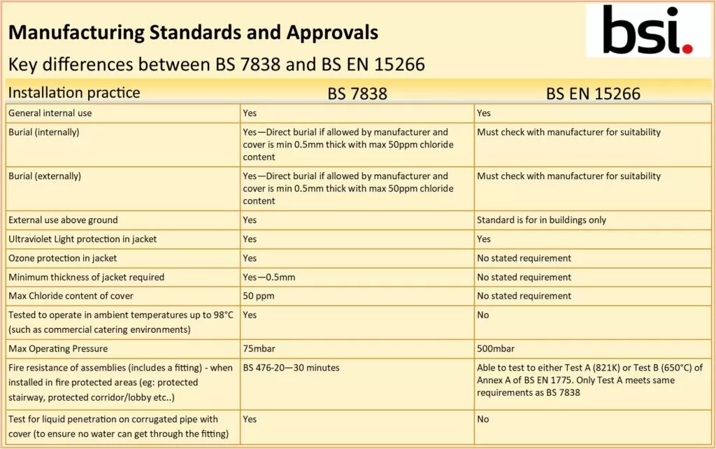 Note: Pliable corrugated (stainless steel) tubing manufactured to BS7838 meets Fire Test A. For pliable corrugated tubing manufactured to BS EN 15266 the manufacturer should be consulted.